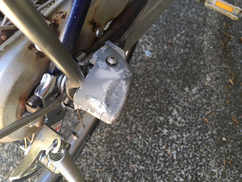 このとおり、ぼろぼろの車体に対して、スタンドの輝きが不釣り合いなほどである。
