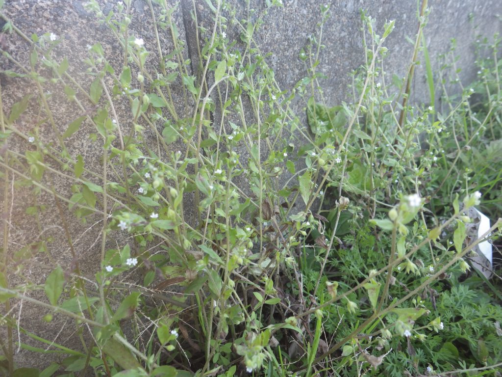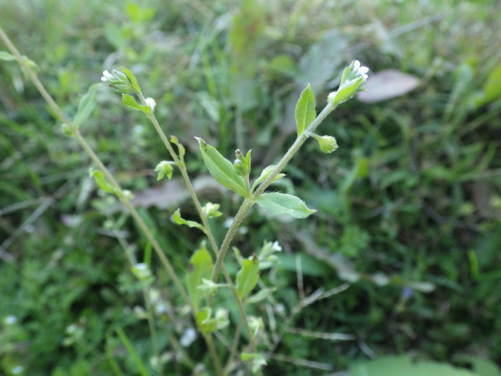 こちらが件(くだん)のキュウリグサ。托葉が花序の直下では欠けている。花序が巻き、同時に咲く花数はハナイバナより多いことが多い。花の青みも若干ハナイバナより強い。