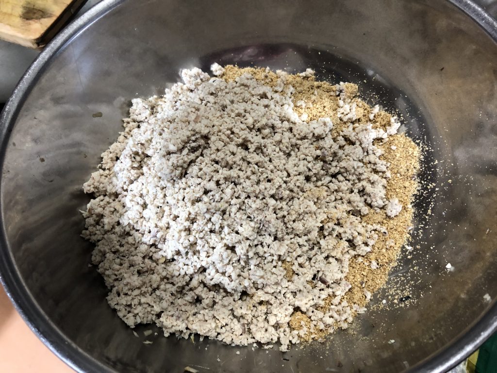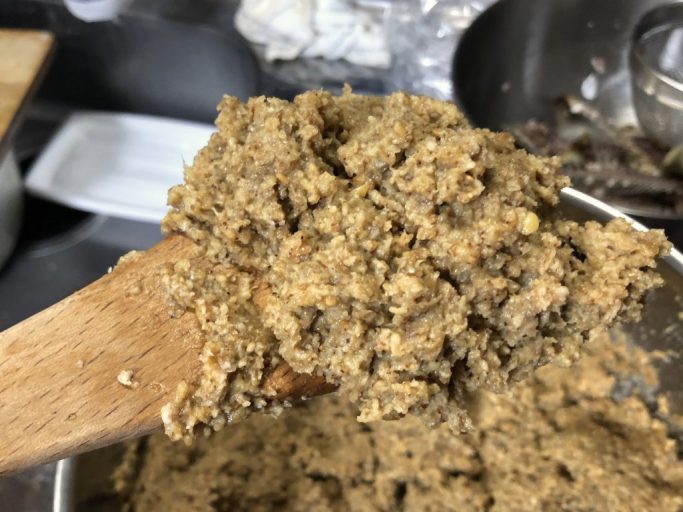 それでもってこの量である。このときは総重量2キロの冷汁の素ができた。木べらで混ぜる腕がめちゃくちゃ疲れたことを今でも覚えている。