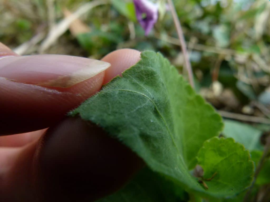 葉にも花柄などと同様に微毛が密生している。これは触ればわかるくらいで、ビロードのような感触だ。サクラスミレの葉にも毛が生えているがまばらで、アカネスミレのような感触はない。