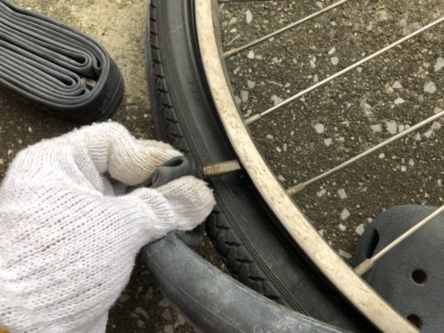続いてチューブ自体をタイヤの中に収納していく。外すときの手順の逆をやろうとするとナットを先につけてしまいそうだけど、ナットはまだです。