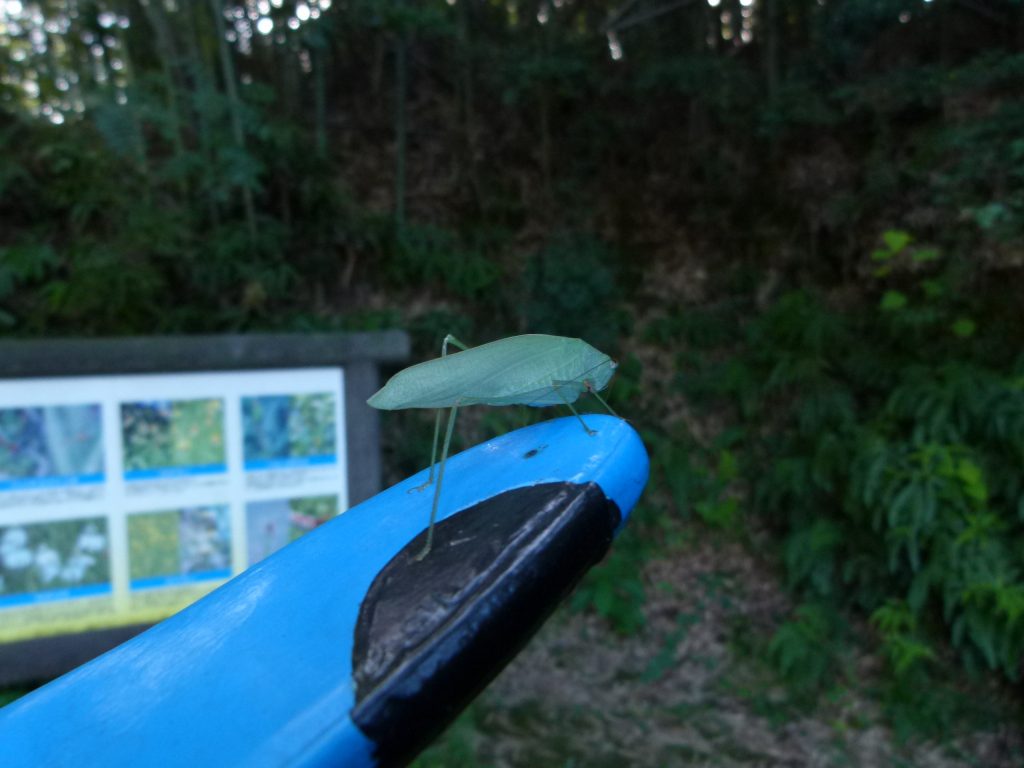 バッタ。あまりバッタには詳しくないので「クツワムシかな?」と思って撮ったけれど、帰って図鑑で調べてみたらサトクダマモドキという虫っぽい。どちらかというとツユムシに近い虫。緑色がきれいだけど、トンボの翅にトンボがとまっている写真の方が撮りたかった。