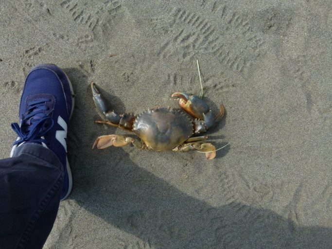 台風のあとのビーチコーミング。トゲノコギリガザミ、かな?