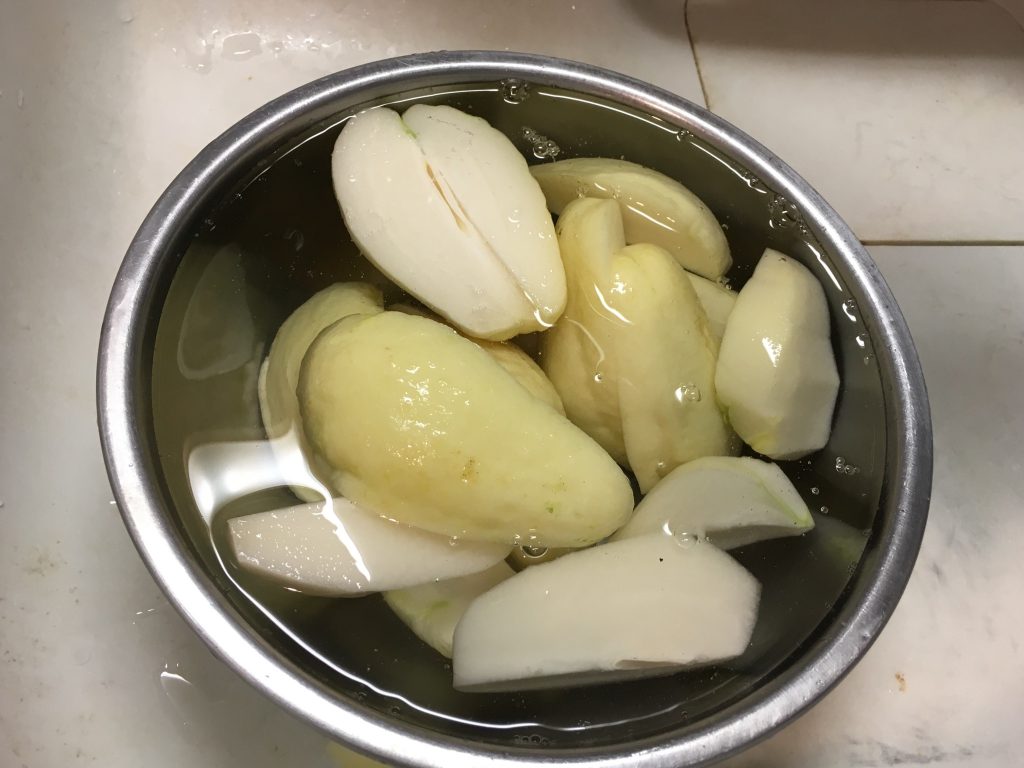 ハヤトウリ、切ると結構ぬるぬるしている。これは灰汁なのだそう。今回のものは若い実のおかげか、そこまでひどくなかったけれど、すごいものだと手についてしばらく取れずに乾いて、黒くカピカピに荒れてしまうこともある。ばあちゃんも昔なっていたけれど、別段痒くもないし……とのことだったので、気にせず素手でいく。気になる人はビニール手袋をするといい。